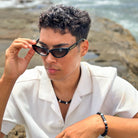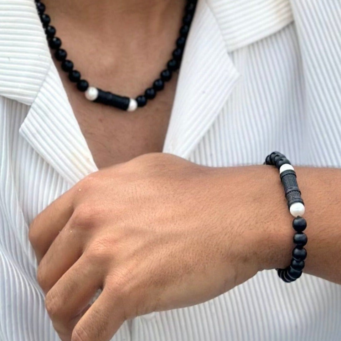 This men's bracelet features a striking combination of Agate beads complemented by an intricately ion-plated black lattice pattern stainless steel centrepiece, gracefully adorned with white freshwater pearls on either side, creating a harmonious blend of earthy and modern elements.