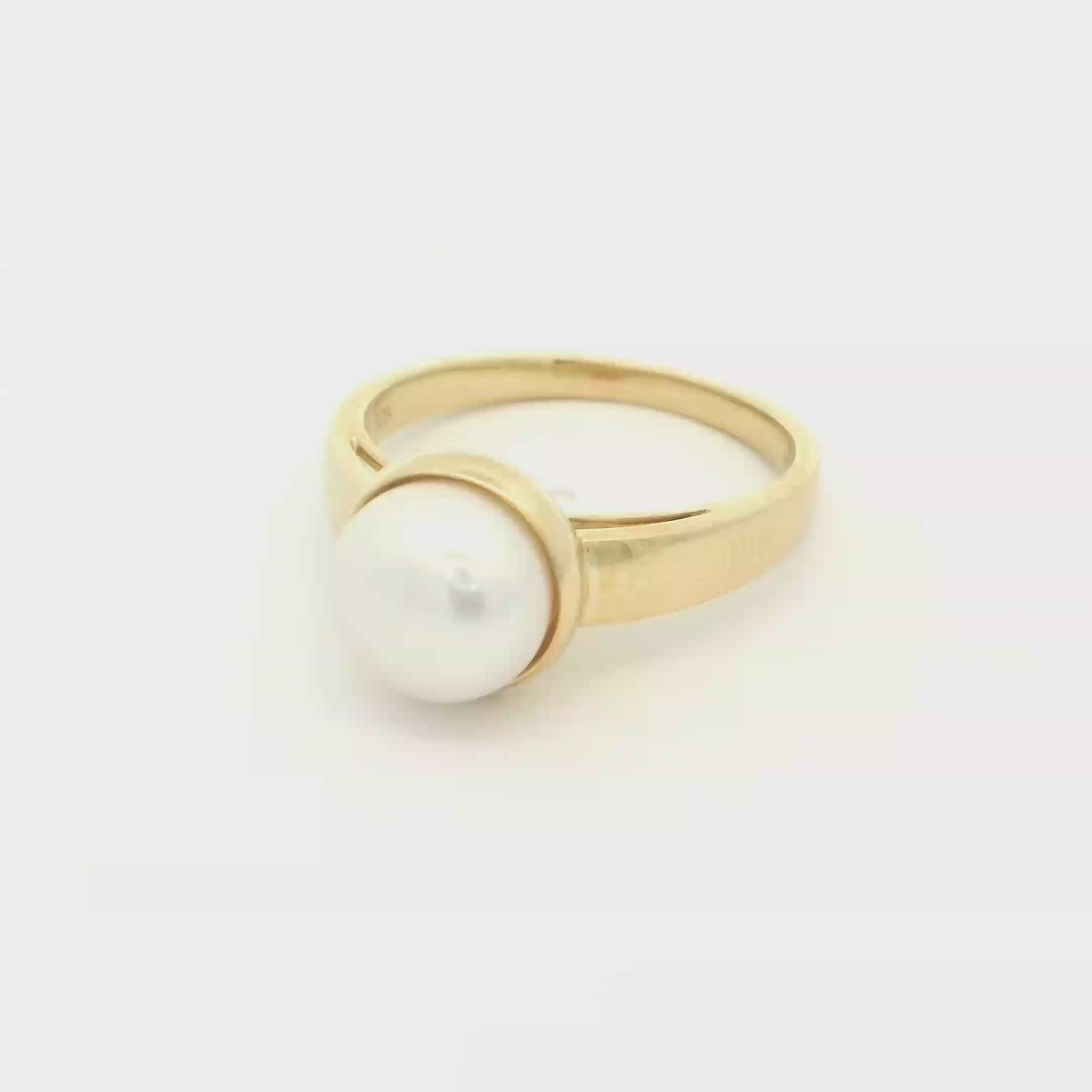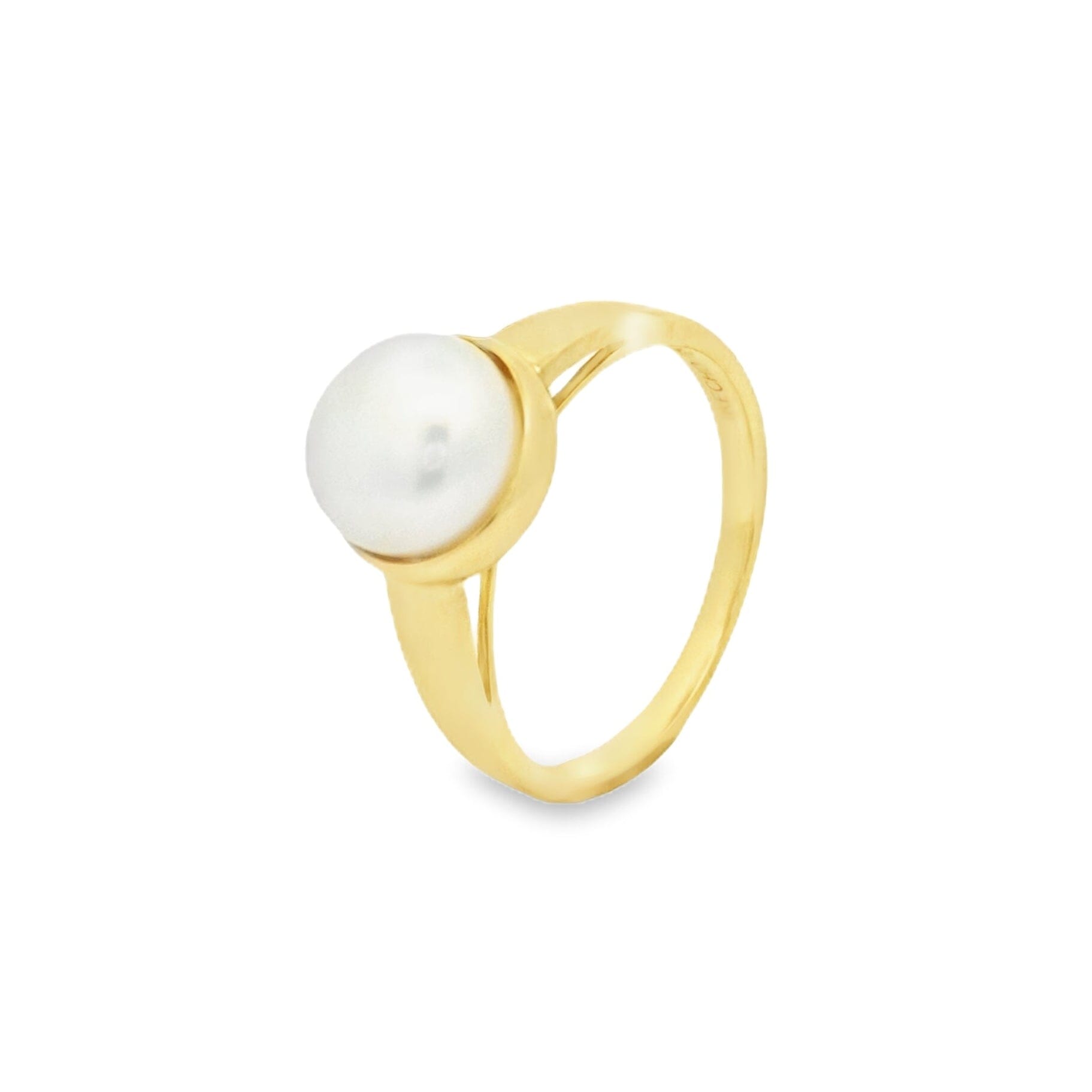 This elegant 9ct yellow gold ring features a timeless design accentuated by a pristine white button freshwater pearl set in a simple and classic arrangement, creating a sophisticated and enduring piece of jewellery.