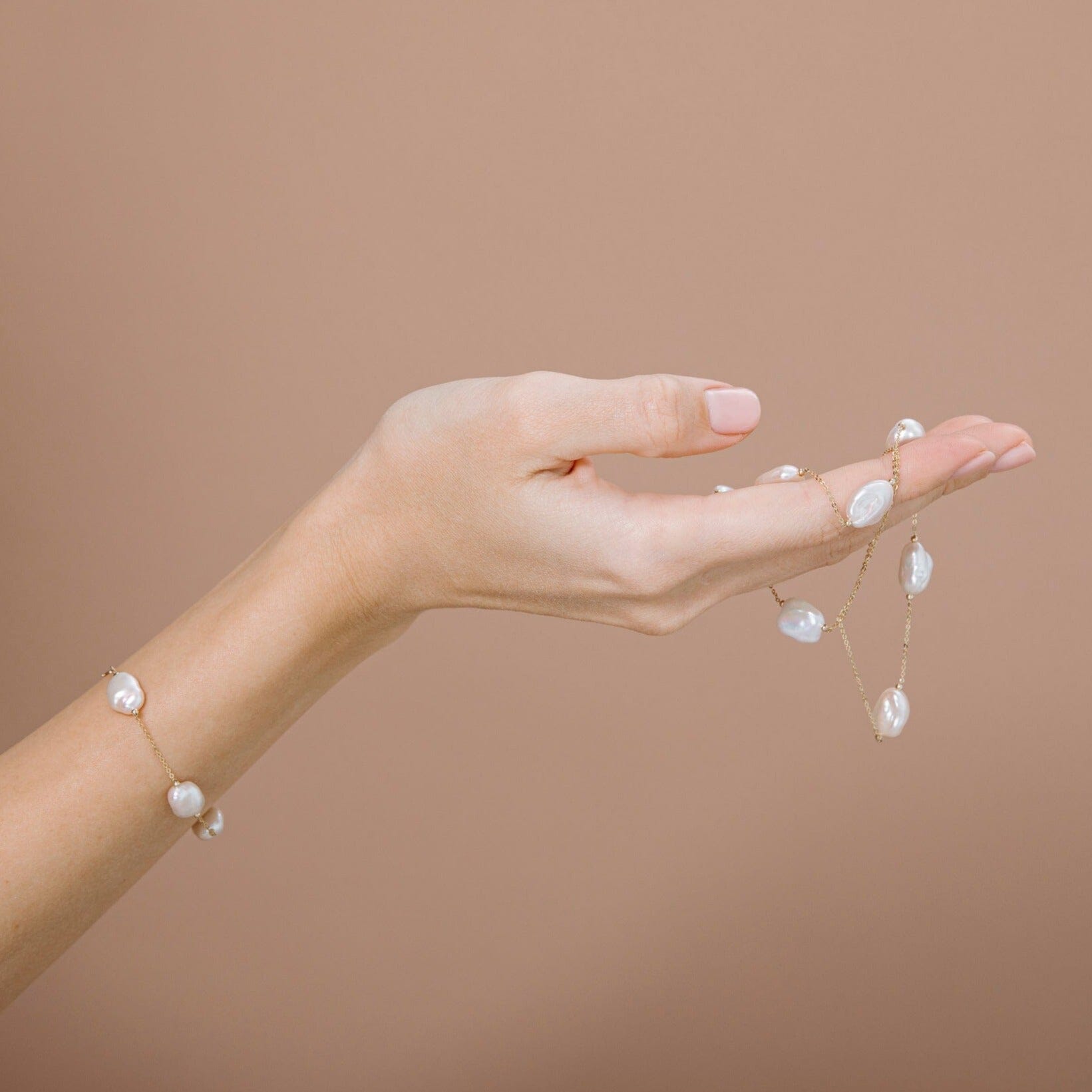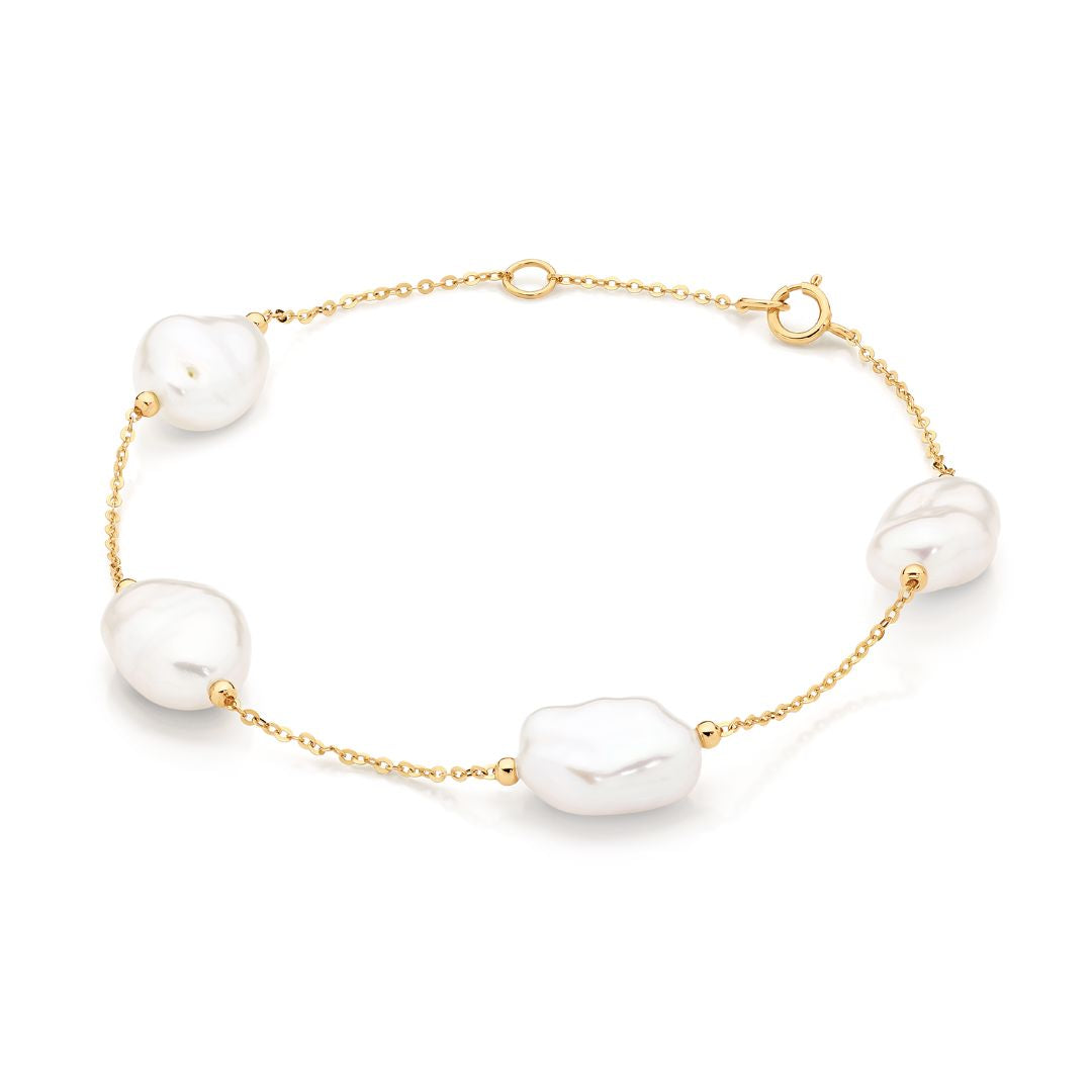 This 14ct yellow gold chain bracelet elegantly showcases a stunning array of white Keshi pearls gracefully adorning its length, creating a timeless and luxurious accessory. Matching earrings and necklace in our Juliette range are also available to create a stunning set.