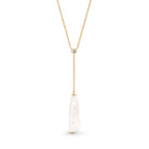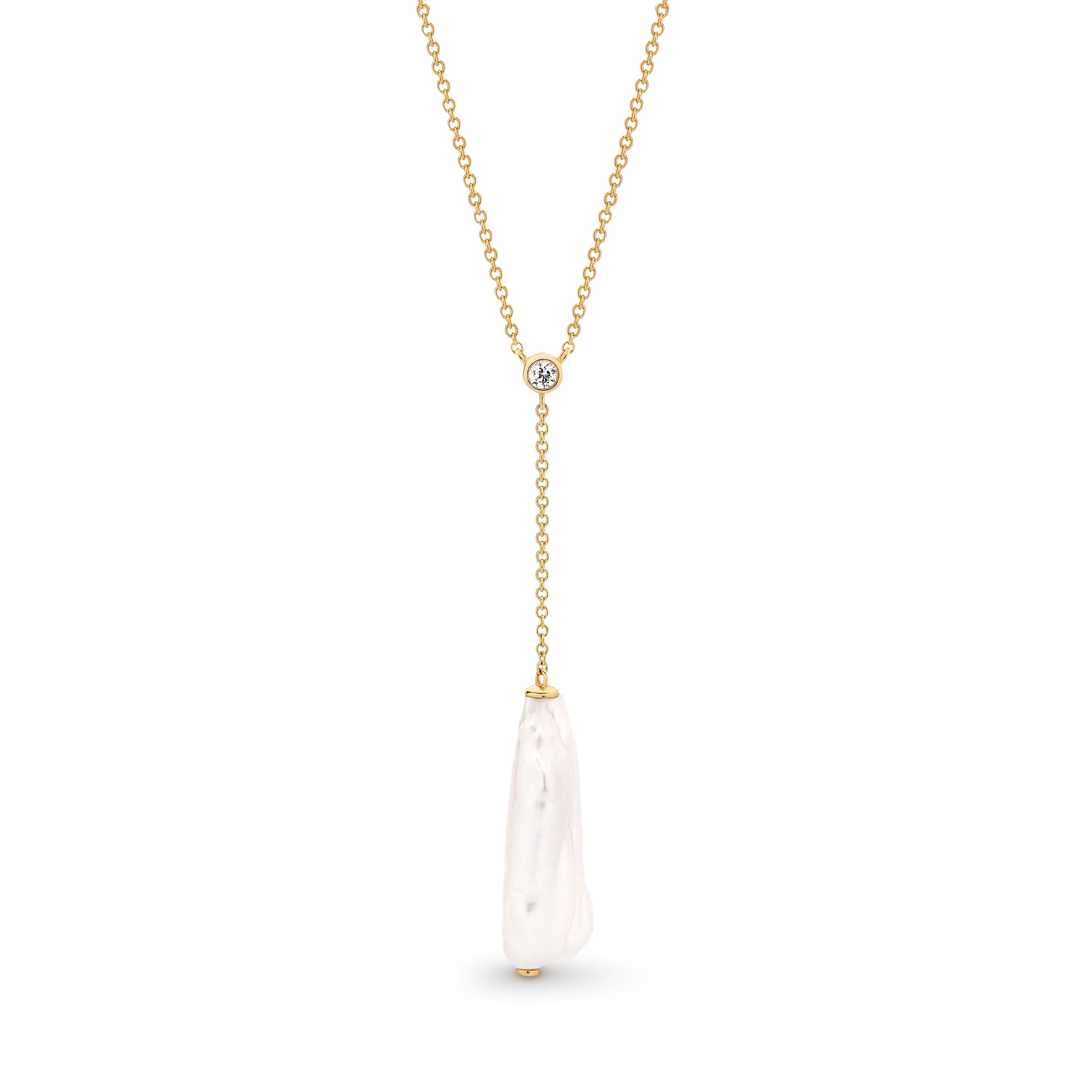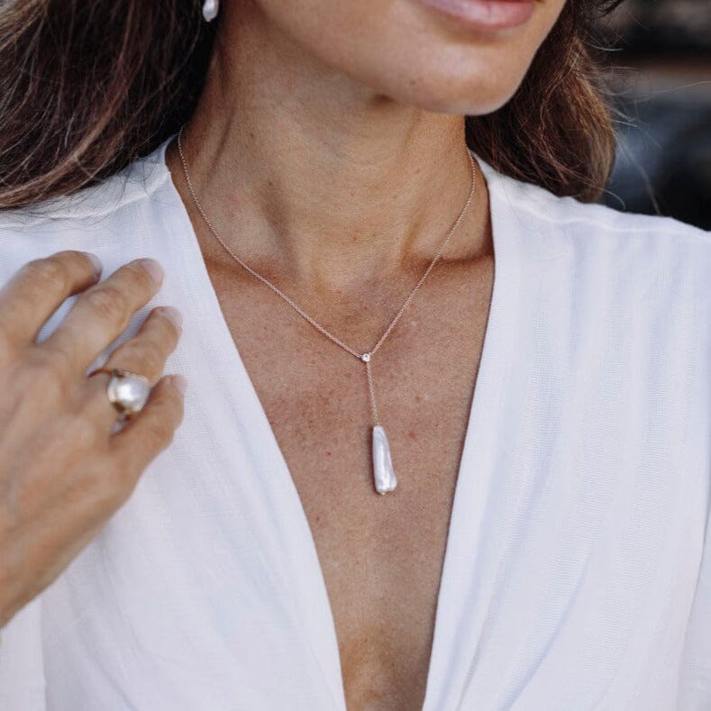Presenting the Louisa Lariat: a stunning embodiment of refined sophistication. Fashioned from 9ct gold and accented with a white topaz at its junction, this piece boasts a descending chain culminating in a suspended white baroque freshwater pearl, delivering an effortlessly chic and elegant statement. Pair it with the Louisa Earrings for a breath taking ensemble.