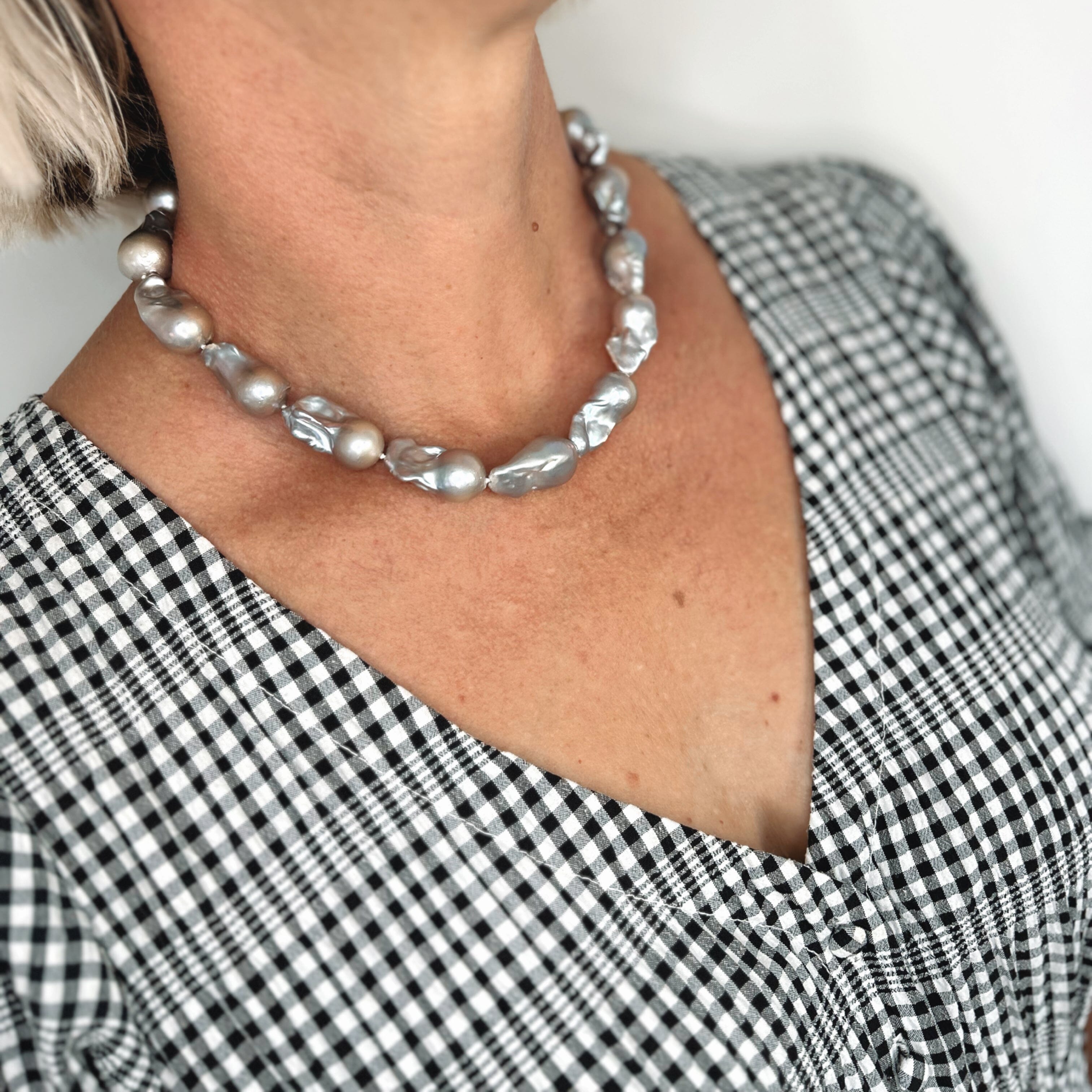 Each Mercury Necklace is truly one of a kind, celebrating individuality with its Baroque nucleated freshwater pearls. The unique mix of textured, alternating pearl colours creates a stunning blend of character and elegance. Finished with a Sterling Silver clasp, this effortlessly stylish piece is perfect for any occasion.