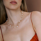 This exquisite necklace, crafted from 14ct yellow gold chain, exudes elegance as it displays a beautiful arrangement of lustrous white freshwater pearls and gold beads that gracefully embellish its entire length, resulting in a timeless and opulent accessory.