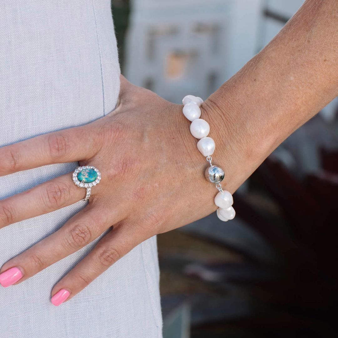 No two pieces are the same—just like you. The Sabrina Bracelet features natural Keshi pearls, each with its own organic shape, making every bracelet a one-of-a-kind treasure. Designed for effortless wear, it’s secured with a Sterling Silver magnetic clasp, combining beauty with convenience. Whether worn alone or layered, this bracelet adds a touch of understated luxury to any look.