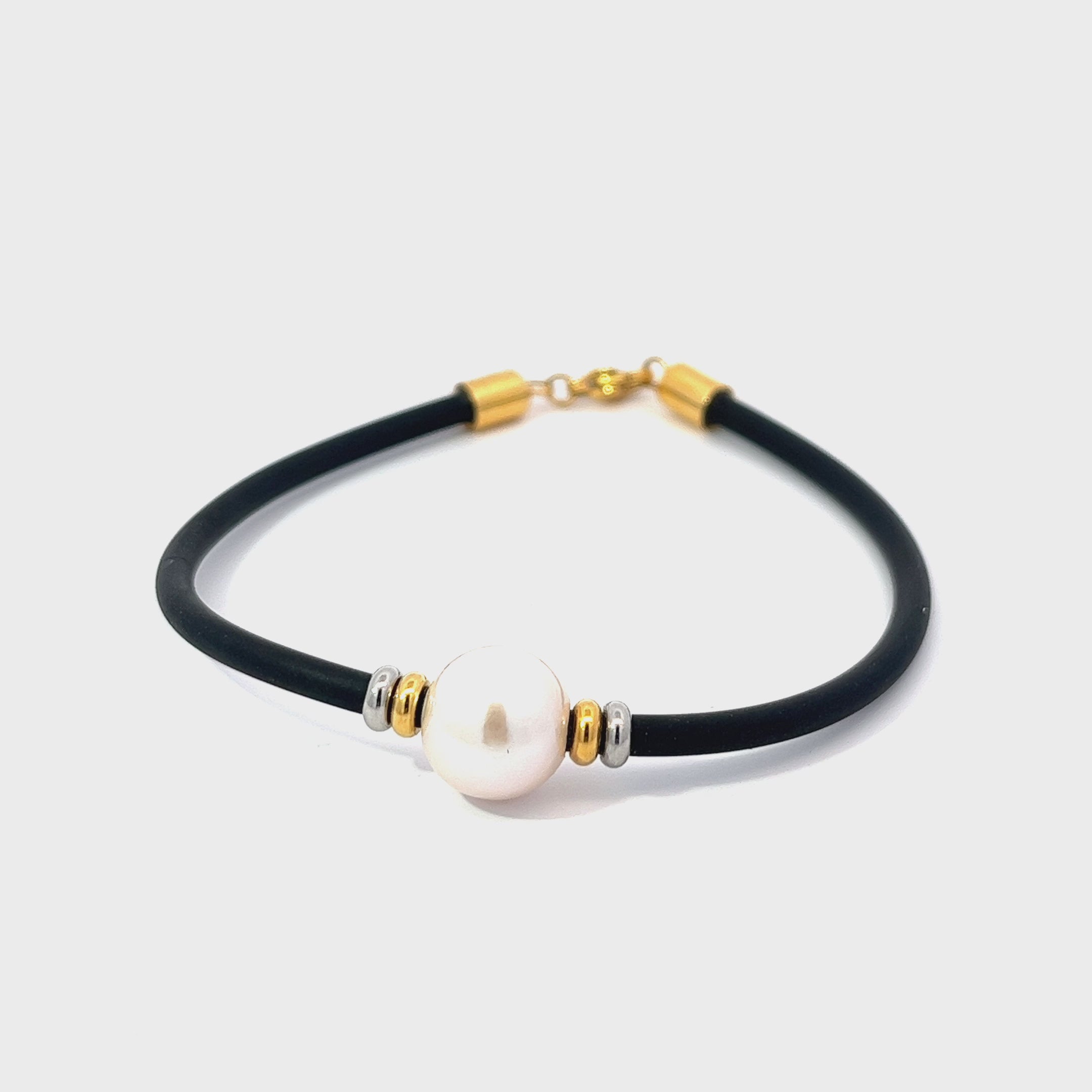Vivienne Bracelet - A stainless steel bracelet available with plain stainless steel or stainless steel gold-plated detailing options. Adorned with a black neoprene band and a lustrous white Edison pearl, it creates a striking fusion of modern elegance and classic sophistication. Combine with the Vivienne Necklace to create a stunning ensemble.