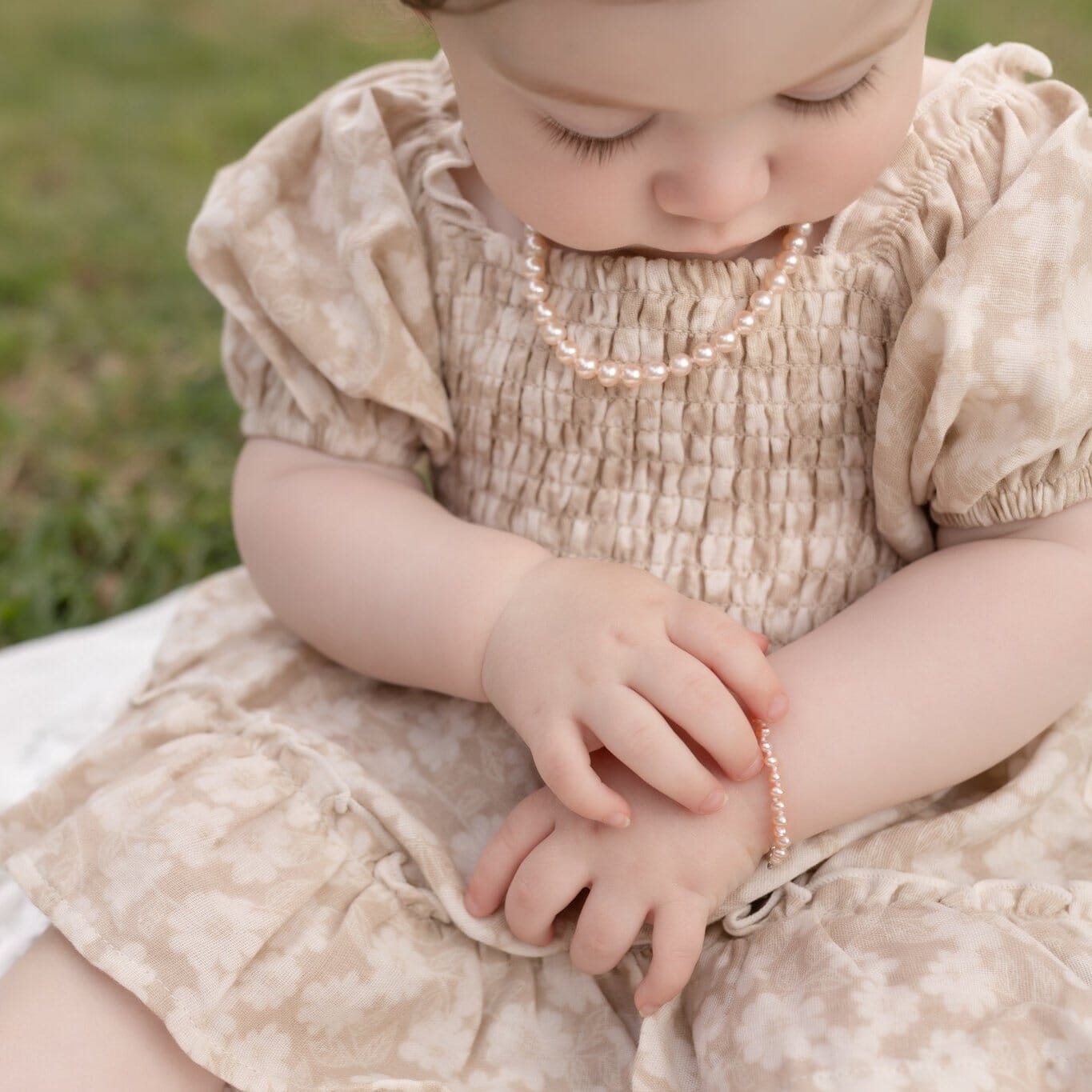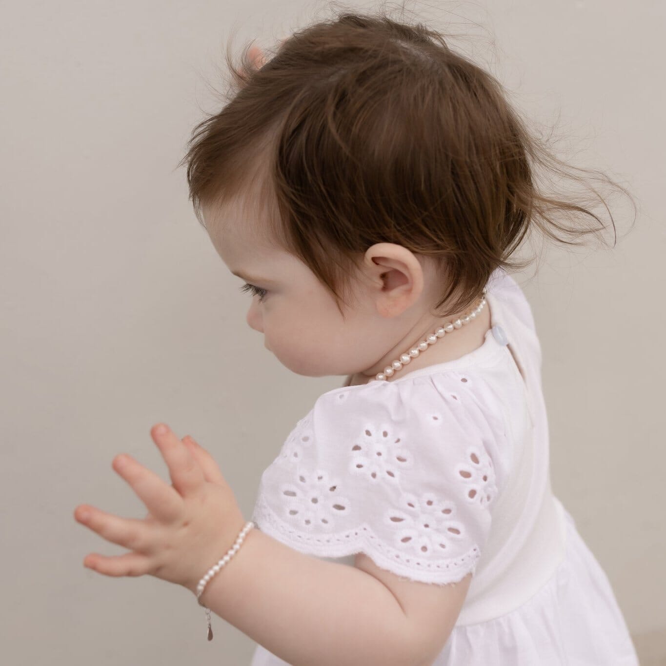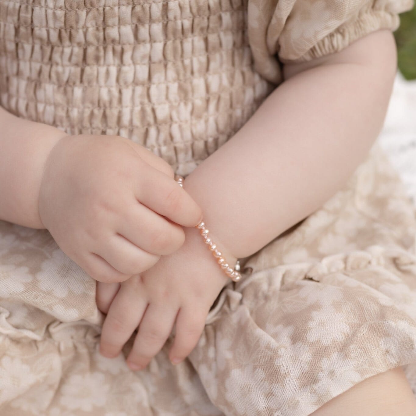 The Dahlia Bracelet, part of our Bambini Collection, is perfectly sized for babies up to 18 months, offering a touch of classic elegance for the tiniest fashionistas. Crafted with delicate, individually knotted pearls in natural white or pink, this bracelet is both stylish and comfortable. Its sterling silver extension chain and secure lobster clasp provide a gentle fit, ensuring it can be cherished through those early, precious months. A beautiful keepsake or thoughtful gift for welcoming a new arrival.