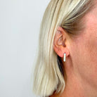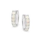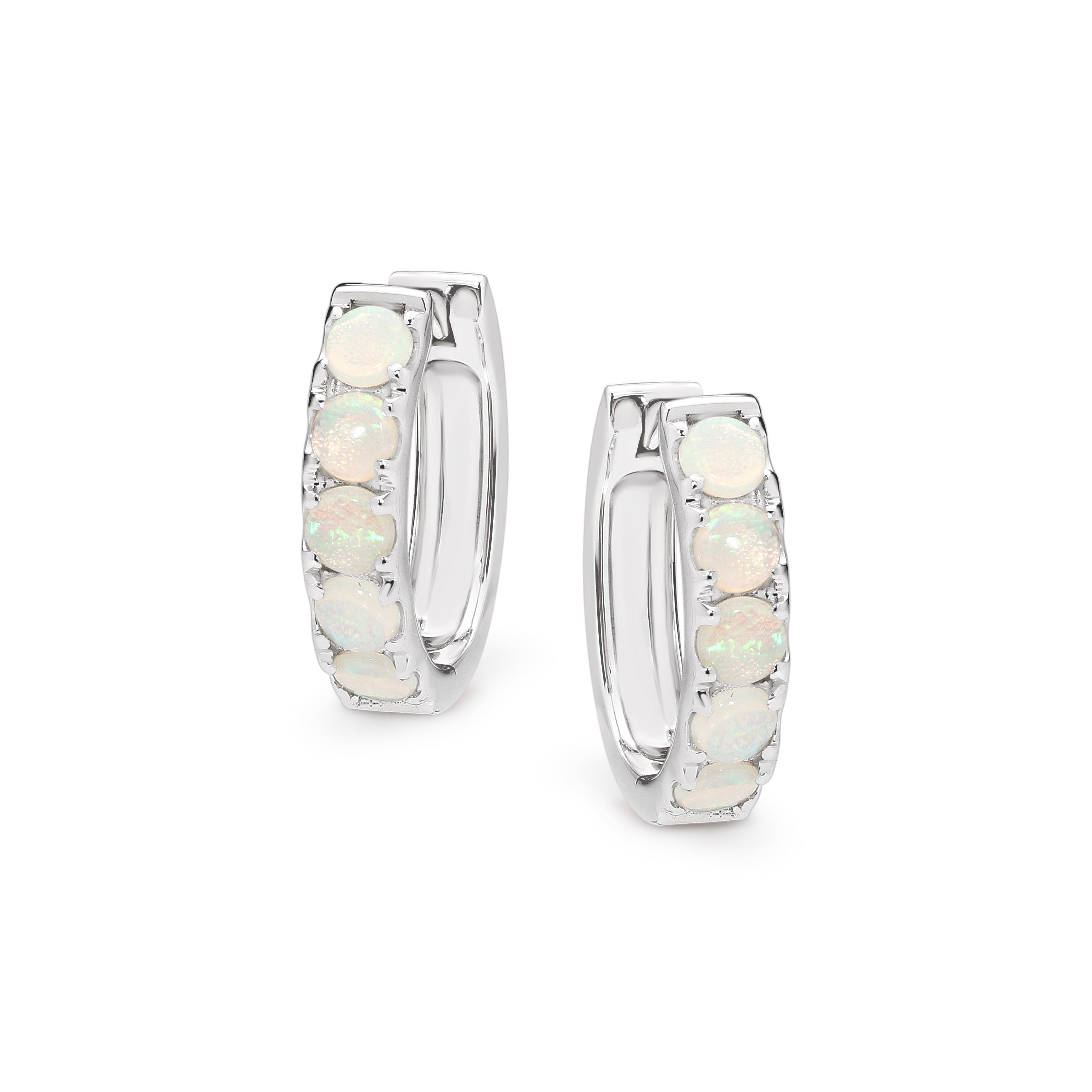 The Nymph Huggies are crafted from sterling silver in a sleek oval shape, showcasing 10 petite round solid light opals (five on each earring) adorning the front. These elegant earrings gently embrace the earlobe, catching the light with every movement for a subtle yet captivating look.