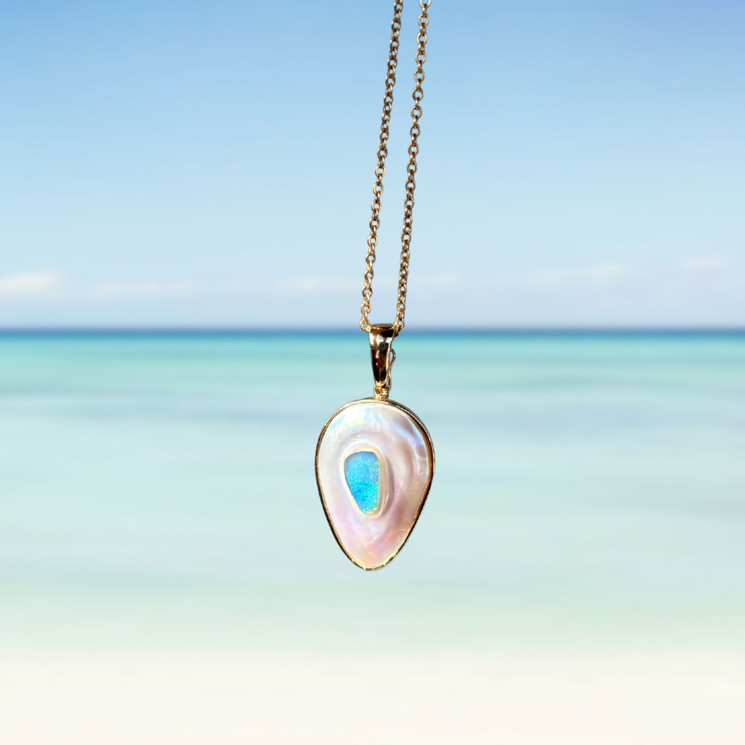 Discover this stunning piece from the Earth+Ocean Jewellery collection, featuring a unique Solid Opal and South Sea Mabe Pearl. Each piece showcases a natural fusion of opal encased in nacre layers by a Batwing Oyster, creating a one-of-a-kind treasure. This collection captures the essence of natural beauty, offering exclusive jewellery that seamlessly blends oceanic and earthy elements through a remarkable natural process.