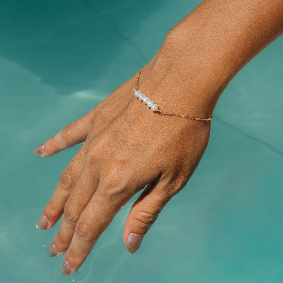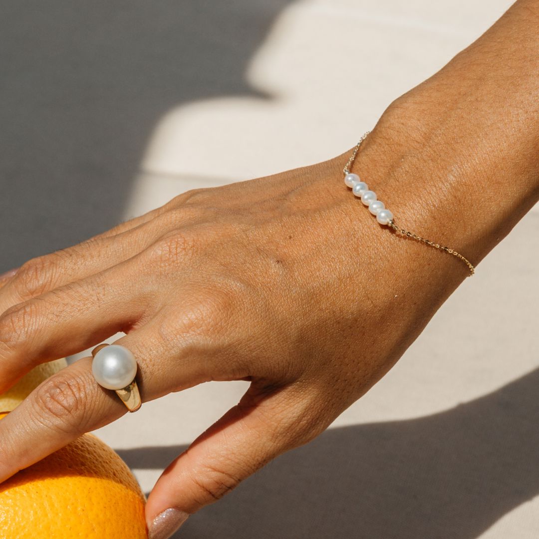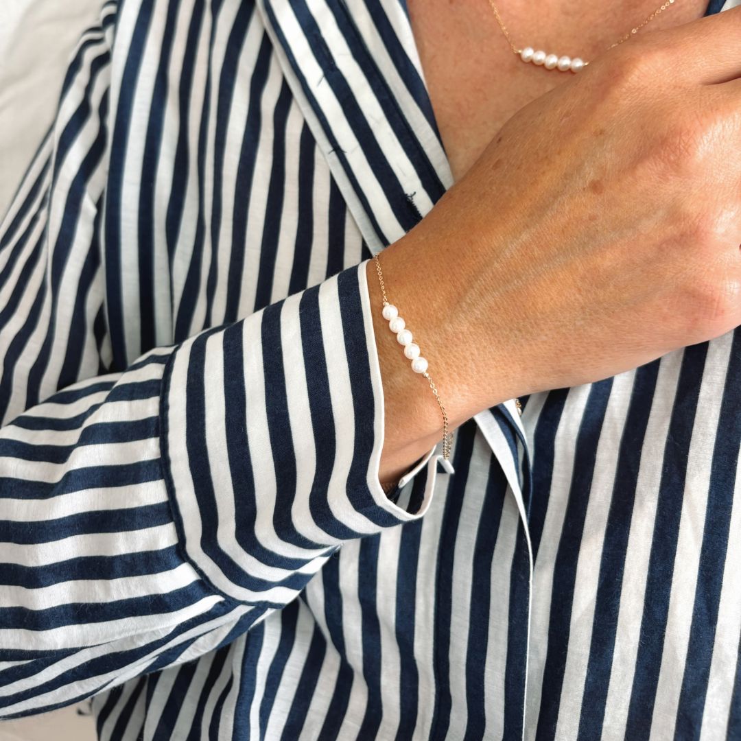 Delicate with a touch of whimsy, the Phoebe Bracelet features five petite freshwater pearls nestled closely together on a fine 14ct yellow gold chain. This graceful cluster creates a soft, elegant focal point — perfect for layering or wearing solo to add timeless charm to your wrist.