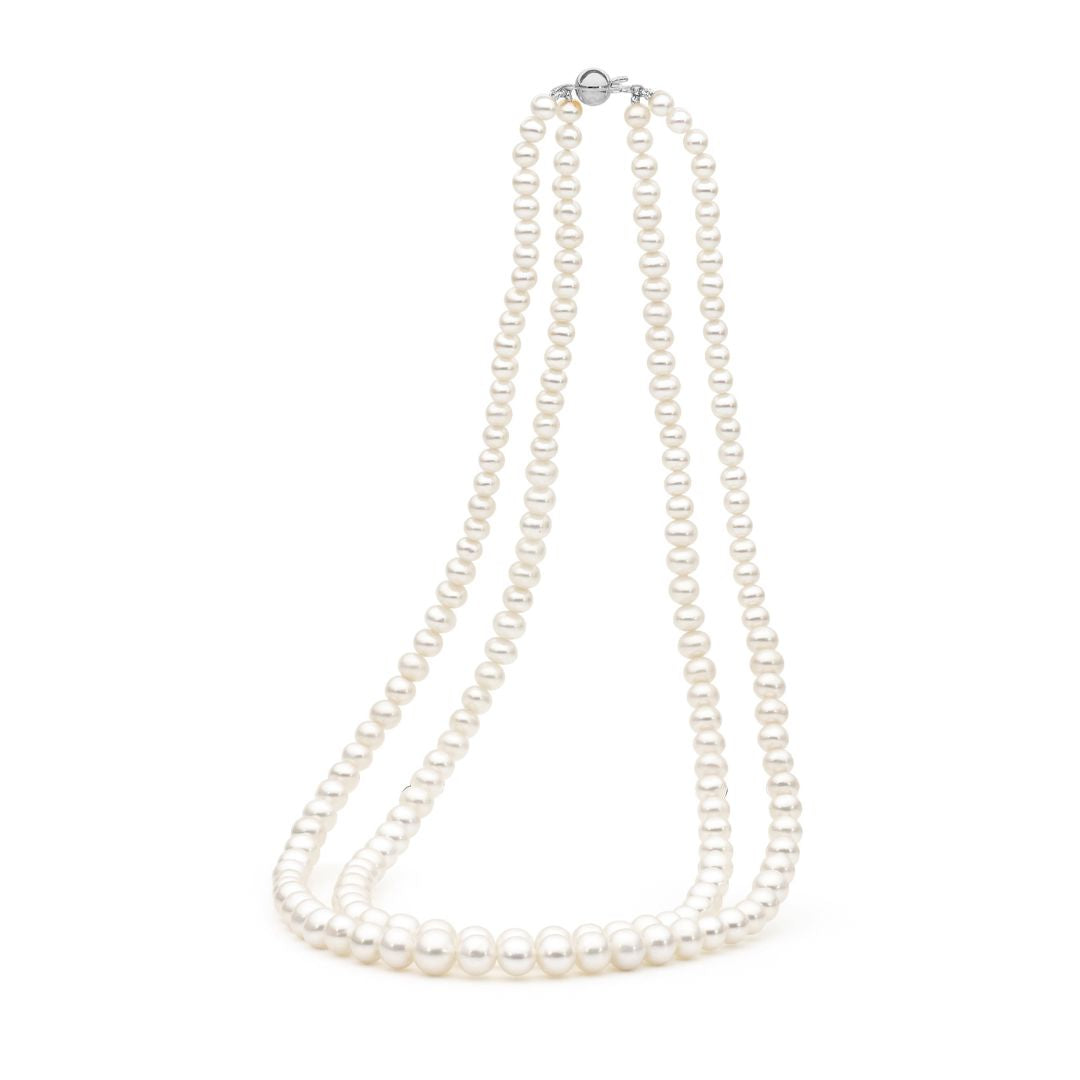 Elevate your style with our exquisite graduated double row freshwater necklace, a flawless fusion of individuality and understated elegance. Featuring a luxurious ball clasp and double strands for added dimension, its effortless versatility ensures it's the ideal choice for every occasion.