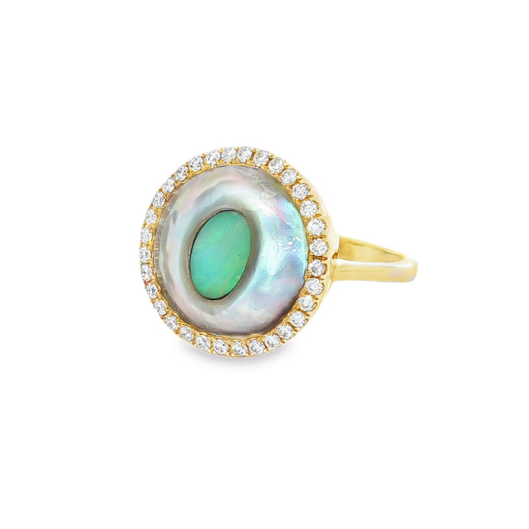 Discover this stunning piece from the Earth+Ocean Jewellery collection, featuring a unique Solid Opal and South Sea Mabe Pearl. Each piece showcases a natural fusion of opal encased in nacre layers by a Batwing Oyster, creating a one-of-a-kind treasure. This collection captures the essence of natural beauty, offering exclusive jewellery that seamlessly blends oceanic and earthy elements through a remarkable natural process.