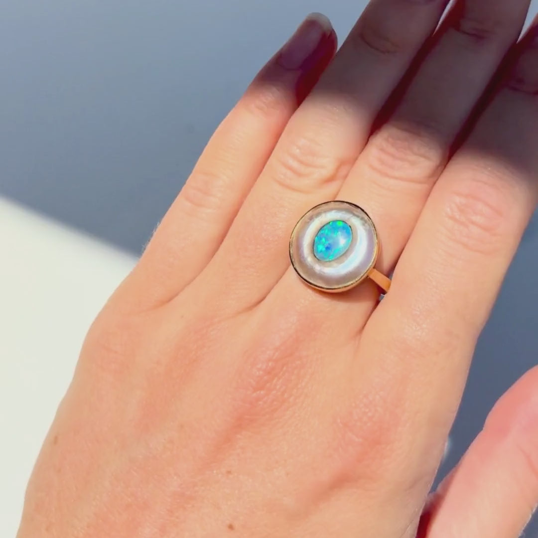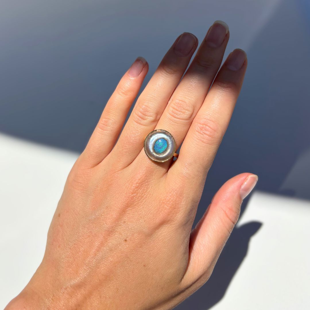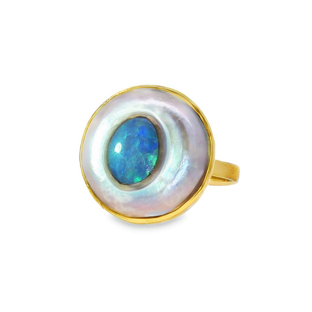 Discover this stunning piece from the Earth+Ocean Jewellery collection, featuring a unique Solid Opal and South Sea Mabe Pearl. Each piece showcases a natural fusion of opal encased in nacre layers by a Batwing Oyster, creating a one-of-a-kind treasure. This collection captures the essence of natural beauty, offering exclusive jewellery that seamlessly blends oceanic and earthy elements through a remarkable natural process.