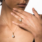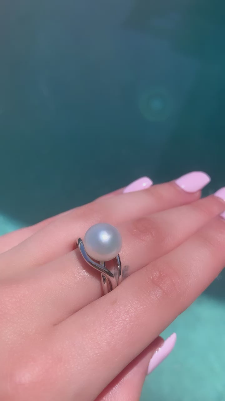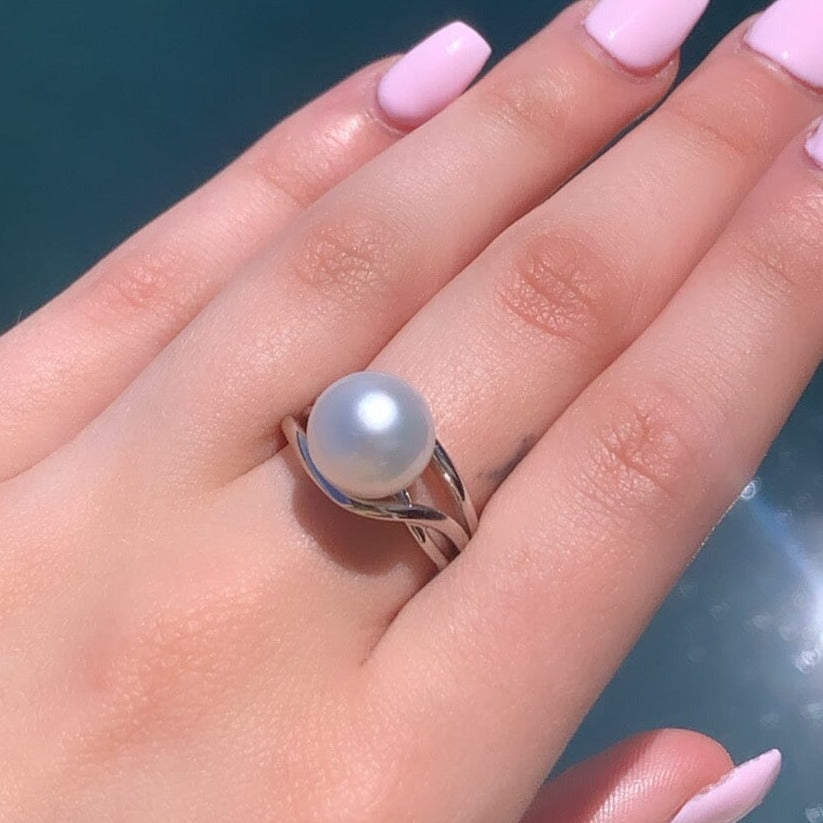 The Moon in Orbit Ring reimagines the classic pearl ring with a contemporary twist, featuring a radiant south sea cultured pearl elegantly set at the heart of an intertwined 9ct gold band. Available in yellow or white gold, offering versatility in styling options, it can be worn alone for a statement or stacked with other bands for a modern layered appearance.