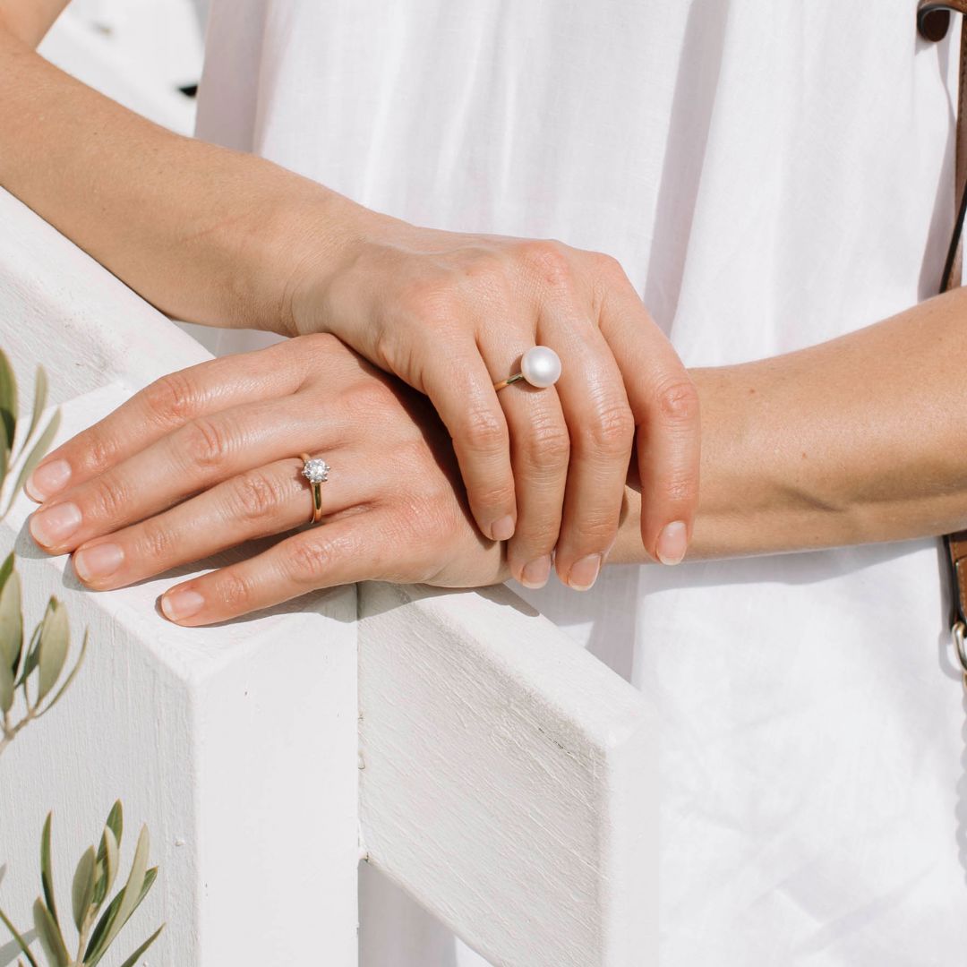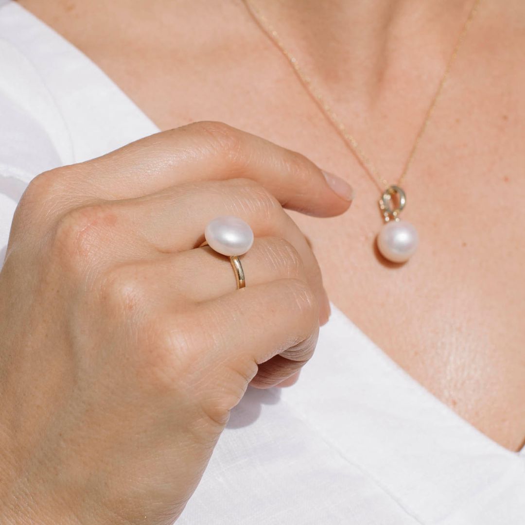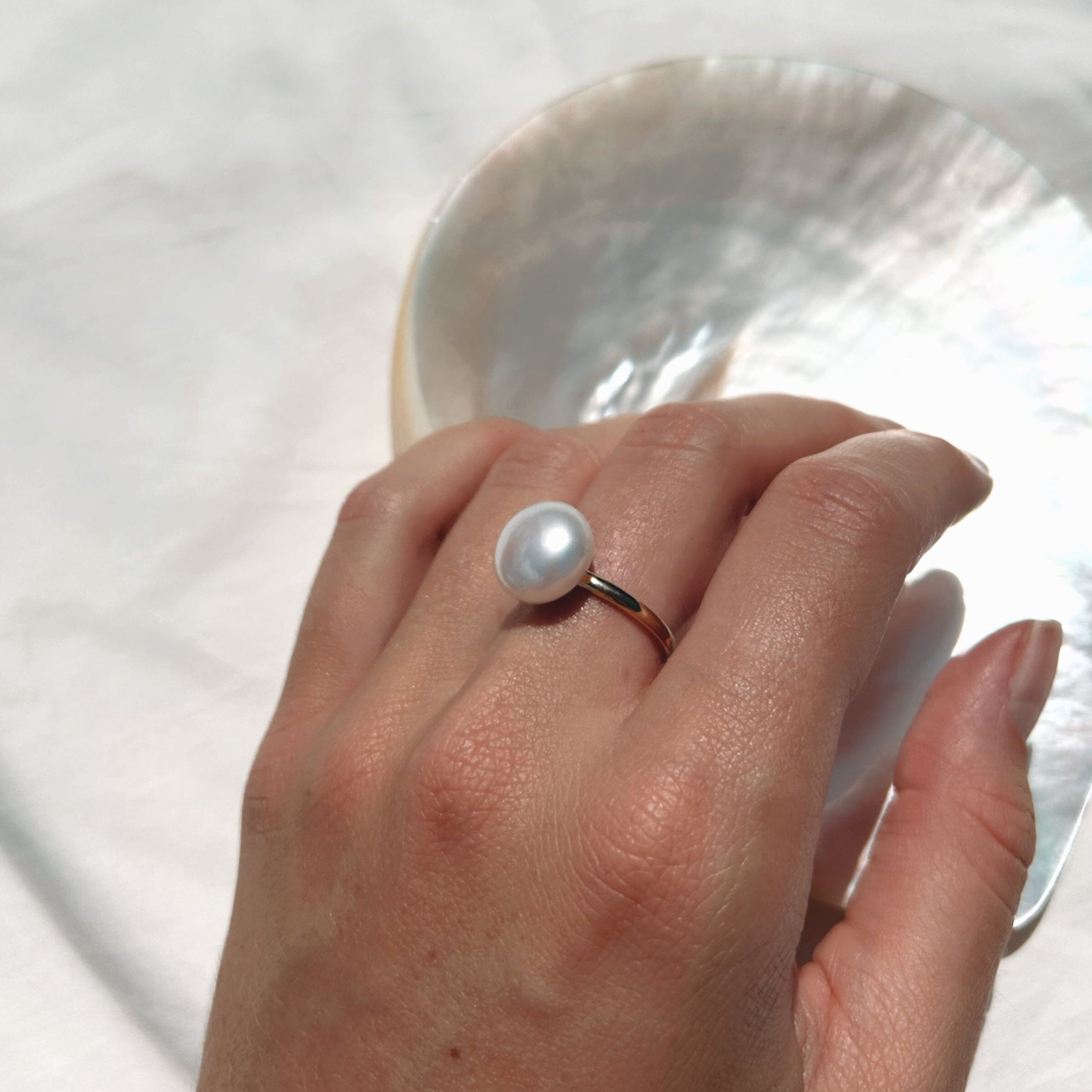 Introducing the Thelma Ring, a timeless adornment. Effortlessly chic, this ring boasts a sleek and sophisticated design, accentuated by a luminous large button Freshwater pearl. Ideal for daily wear, it exudes understated elegance, making it the perfect accessory for any occasion.