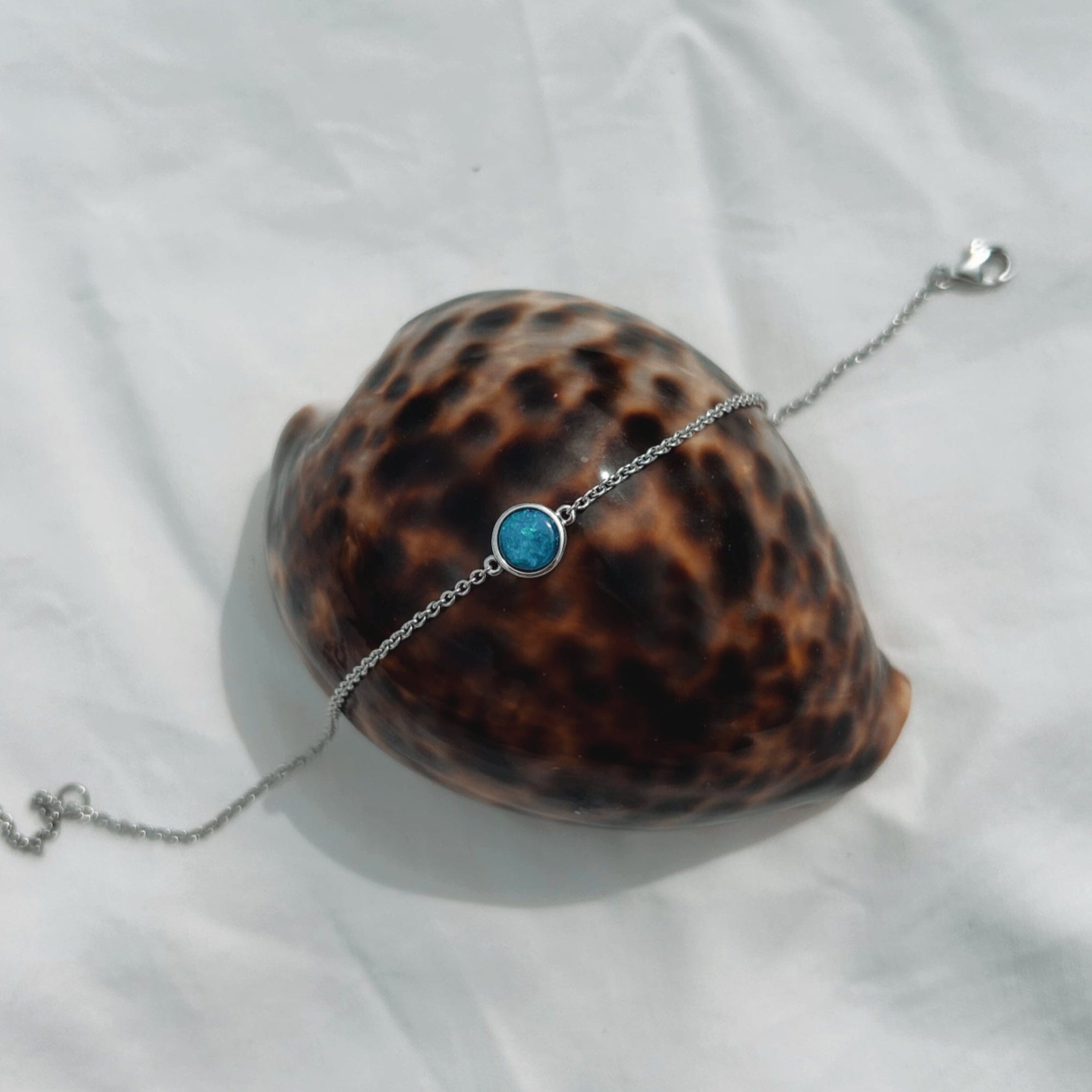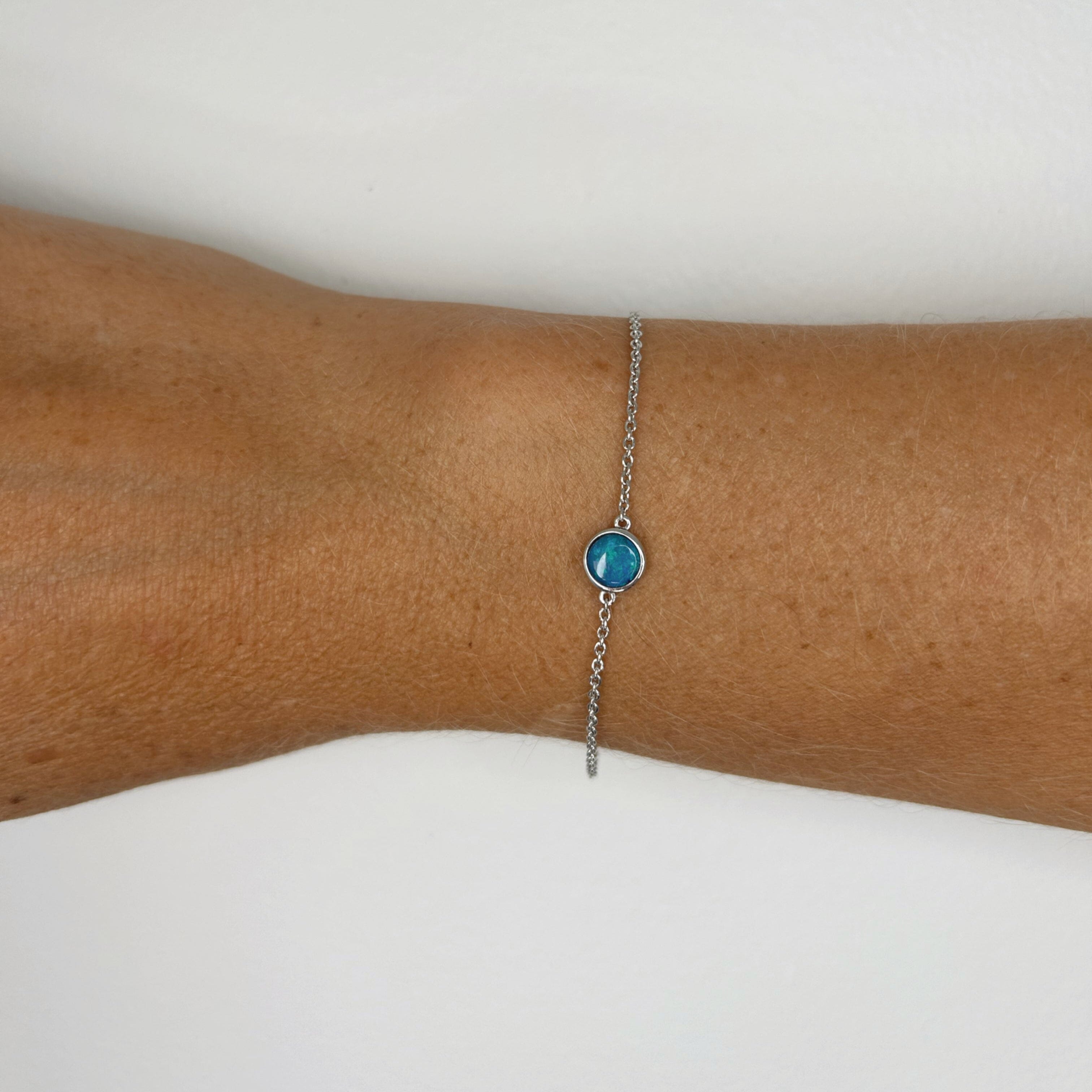 The Ayla Bracelet features a single luminous round opal, its mesmerising play of colour set delicately on a fine Sterling Silver chain. With its minimalist elegance and timeless appeal, this bracelet is perfect for everyday wear or adding a subtle, sophisticated touch to any look.