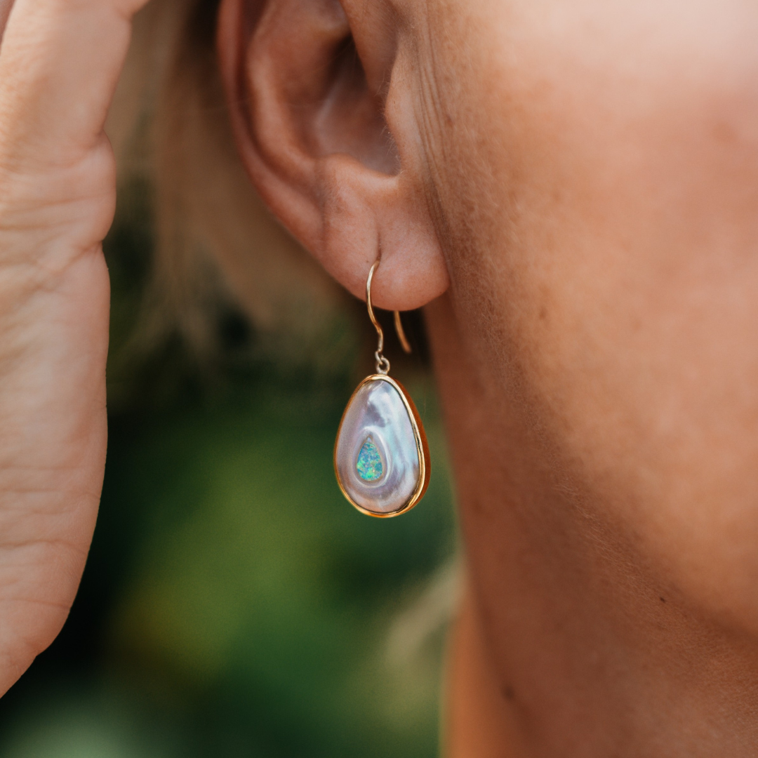 Discover this stunning piece from the Earth+Ocean Jewellery collection, featuring a unique Solid Opal and South Sea Mabe Pearl. Each piece showcases a natural fusion of opal encased in nacre layers by a Batwing Oyster, creating a one-of-a-kind treasure. This collection captures the essence of natural beauty, offering exclusive jewellery that seamlessly blends oceanic and earthy elements through a remarkable natural process.