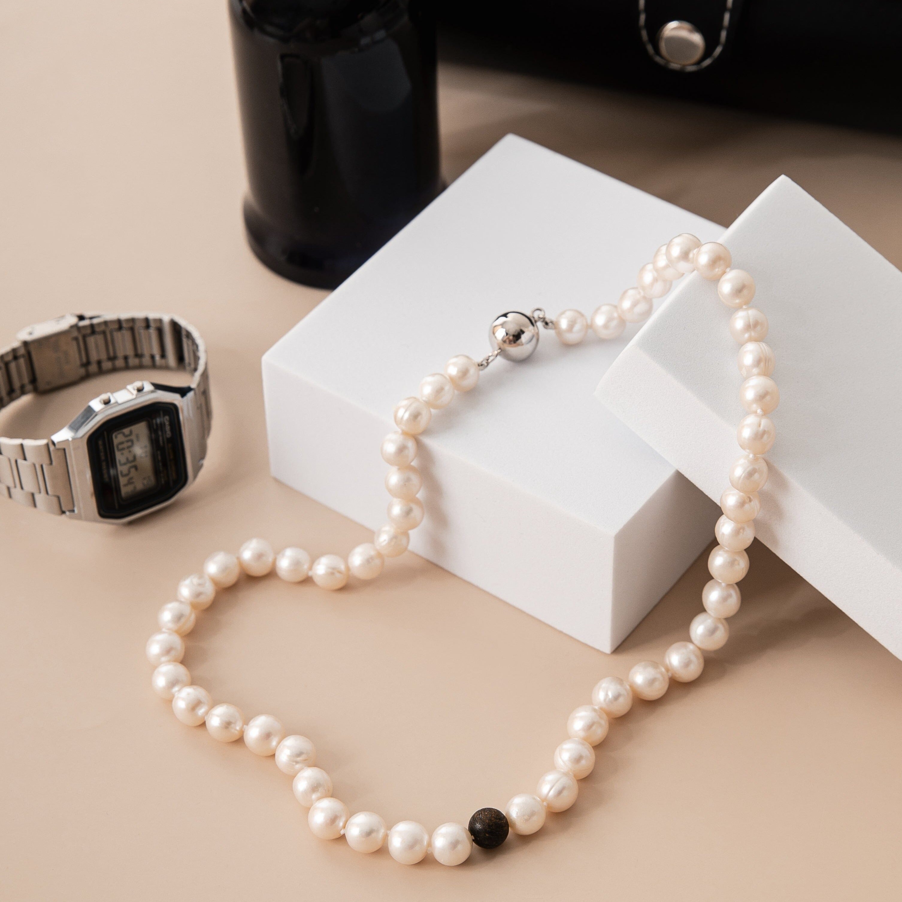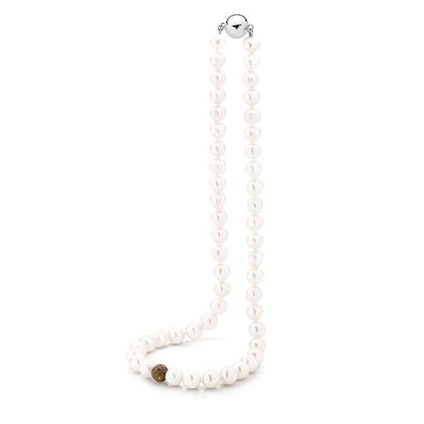 The Harry Necklace, a favoured choice among men, combines the timeless elegance of white freshwater pearls and the bold presence of the Bronzite feature bead exudes elegance and masculinity. Its secure stainless steel magnetic clasp ensures both style and convenience in one accessory.