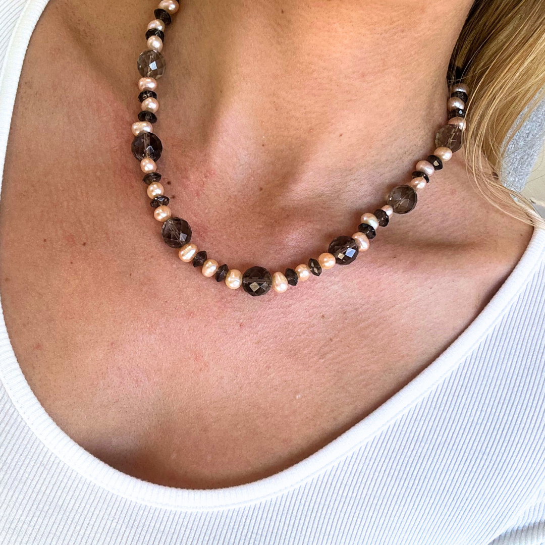 Elegance meets earthy allure in this stunning necklace, 'Wynter'. Alternating smoky quartz and lustrous white oval freshwater pearls exude sophistication, complemented by a sterling silver clasp with an extension for a perfect fit. Elevate your style with its versatile charm, whether for a casual outing or a formal affair.